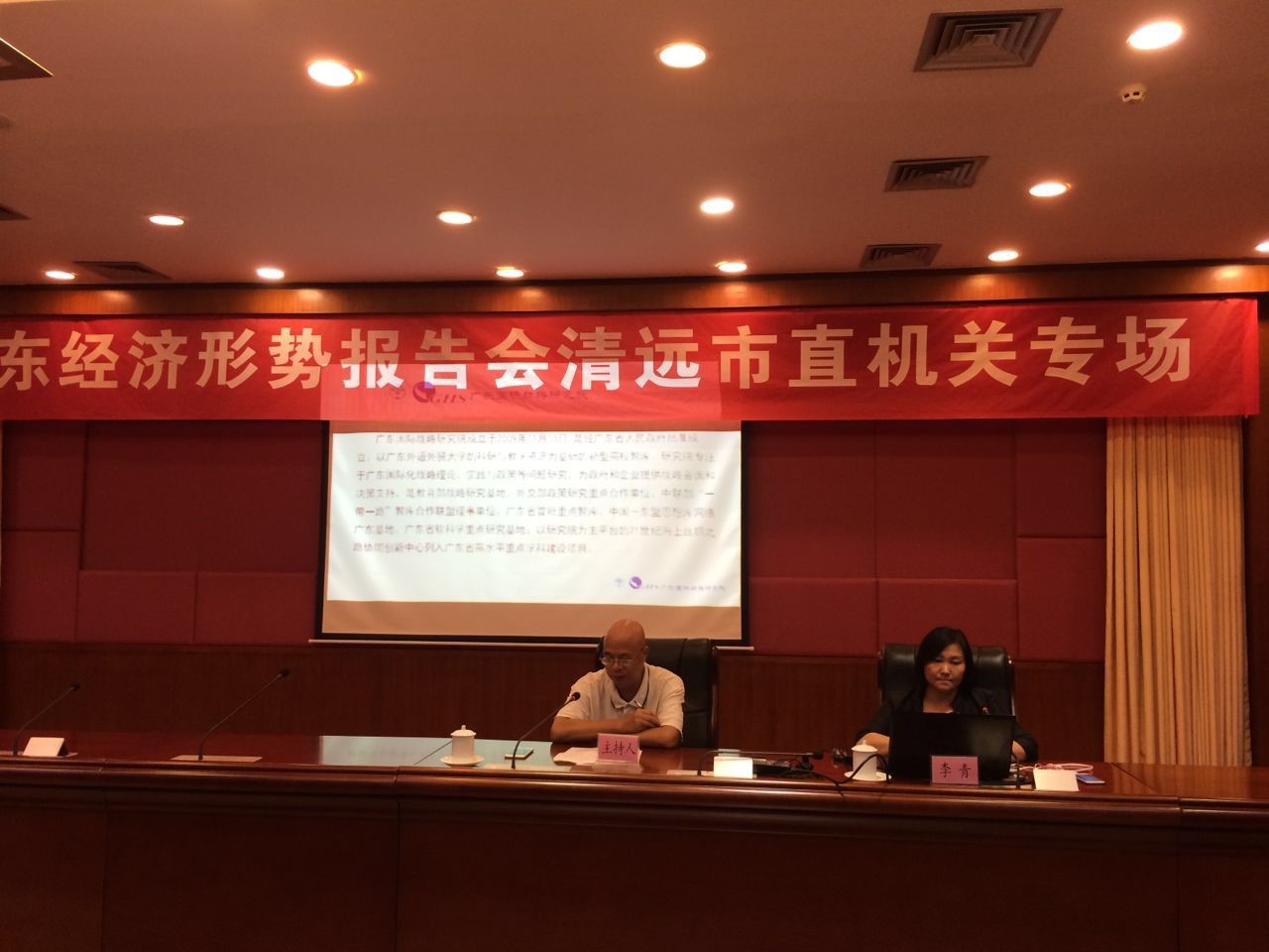 为全面贯彻党的十九大精神,以习近平新时代中国特色社会主义思想为指导,深入贯彻习近平总书记对广东重要指示批示精神,牢固树立“四个意识”、坚定“四个自信”,深入开展广东经济形势群众性宣传教育,引导机关干部职工正确认识和把把握当前国际国内形势,落实省委十二届四次全会精神,为开创广东工作新局面、奋力实现“四个走在全国前列”而共同奋斗。7月16日下午,市直工委牵头举办“广东经济形势报告会清远市直机关专场”,邀请了广东外语外贸大学教授、广东国际战略研究院秘书长李青博士做主题报告。报告会由市直工委龚志强书记主持,市直机关党群系统23个单位、共140多名干部职工参加了报告会。